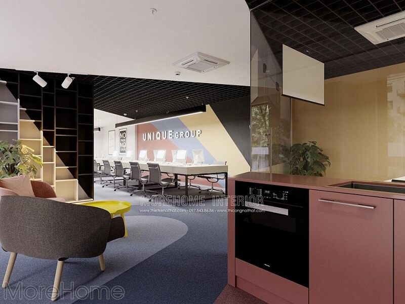 Mẫu thiết kế văn phòng độc đáo với tông màu chủ đạo hồng vàng xanh ấn tượng.