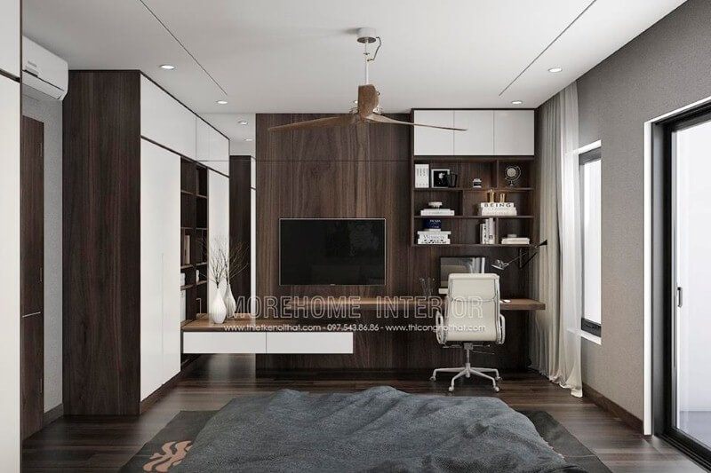 Bố trí nội thất phòng ngủ master hiện đại, đẹp có bàn làm việc.