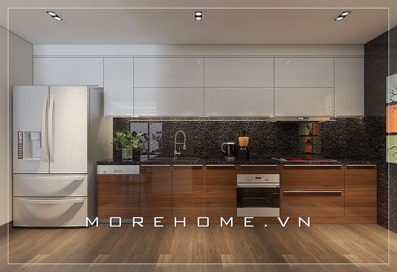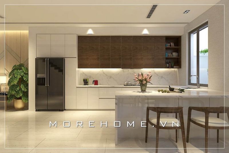 Thiết kế nội thất phòng bếp hiện đại bằng gỗ tone màu trắng sẽ tạo nên một không gian nấu nướng tiện nghi cho người nội trợ. Điều này sẽ làm ấn tượng mạnh mẽ với những ai đến thăm.