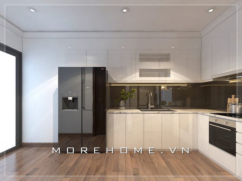 Tủ bếp gỗ acrylic chữ L màu trắng hiện đại là một lựa chọn tuyệt vời để trang trí căn bếp chung cư.